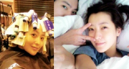 5日下午,金喜善把清晨刚醒时与丈夫一起躺在床上的照片放到了自己的“迷你小窝”博客中。照片中的金喜善虽然是一幅还没睡醒的面容,嘴角却挂着甜美的微笑。她在留言里撒娇地说:“被电话铃声催醒了。本来可以再睡一会儿的……”,让人忍俊不止。