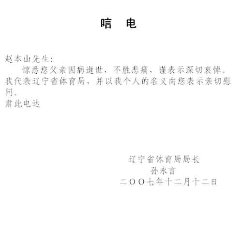 惊悉您父亲因病逝世,不胜悲痛,谨表示深切哀悼。我代表辽宁省体育局,并以我个人的名义向您表示亲切慰问。