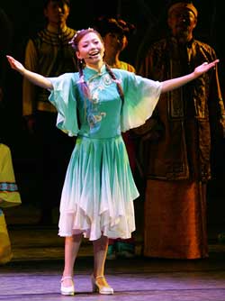 “好一朵美丽的茉莉花……”昨晚身着华服的张靓颖出现在保利剧院的舞台上。尽管很多人怀疑张靓颖能否胜任歌舞剧《茉莉花》的表演,但她昨天还是交上一份不错的答卷。与先前在音乐剧《电影之歌》中的表演相比,张靓颖此次表演难度更大。除了民族唱腔的唱段之外,她昨晚的舞蹈水平也有了飞速的进步。虽然其动作身姿还不如中国歌剧舞剧院的专业舞蹈演员,但其舞技已能和剧情融为一体。(记者王菲)