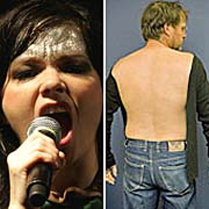比约克(左),被袭记者展示撕烂的上衣(右)。