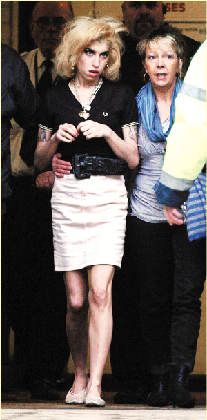 美国有“癫后”布兰妮长期霸占娱乐版面,英国则有“毒后”艾米·怀恩豪斯制造新闻点。上周五她在审讯结束前5分钟赶到法庭,为被控伤人及行贿等罪名的25岁老公Blake打气,还公然于庭上高喊:“老公我爱你!你是最靓仔有型的!”送给Blake一颗定心丸,有目击者就表示,Blake随即以口形回应:“你怎样啦?”艾米只懂不断重复:“爱你!爱你!”恩爱得旁若无人。不过艾米当天邋遢异常,蓬头垢面甚至穿着残旧芭蕾舞鞋就来到法庭了。