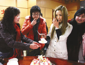 自超女比赛结束后,何洁的话题新闻就源源不断:颁奖礼上摔倒、跪着接受采访、机场昏倒、出车祸……俨然成了“话题女王”。昨日下午,她作客本报与山城“盒饭”欢聚一堂,坦然表示欢迎大家问“负面新闻”,还亲手为“盒饭”切蛋糕。