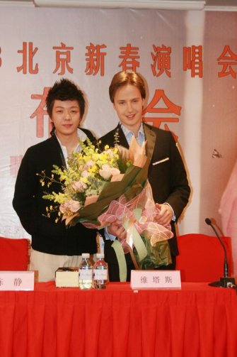 中新网1月24日电 “俄罗斯第一高音王子”Vitas今晚(1/24)将于北京首都体育馆举行“王者归来 Vitas新春演唱会”,昨天下午他于北京举行记者会时,曾以演唱Vitas代表作《Opera2》的超人气“海豚音小王子”王栎鑫特别到场与偶像相见欢,而Vitas的魅力让总是活蹦乱跳的王栎鑫突然害羞了起来,却还是忍不住用练习多时的俄语对他大呼“我爱你”!