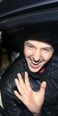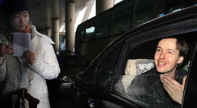 昨日下午从2点多开始,机场大厅就陆续出现前来接机的歌迷。数十名铁杆粉丝装备齐全,有的手捧鲜花,有的拉开写着俄语“欢迎回家”字样的横幅。15点56分飞机抵达机场,数分钟内,Vitas就飞速地从出口走出,黑夹克黑裤子的他虽然衣着低调,还是被眼尖的歌迷认出,接着机场大厅迅速充斥着呼喊Vitas名字的尖叫声。眼见歌迷的热情,Vitas友善地用中文回应大家:“我爱你们!”短短四个字令歌迷更加疯狂。有人甚至冲破层层障碍冲到Vitas身边,把鲜花送予其手中,献花成功的该歌迷立刻引来其他人的羡慕眼光。Vitas行色匆匆地走至停车场,露脸不过短短几分钟后,钻进了黑色宝马车内。临走前,他一个转身,朝刚才护驾的歌迷送出一个飞吻。