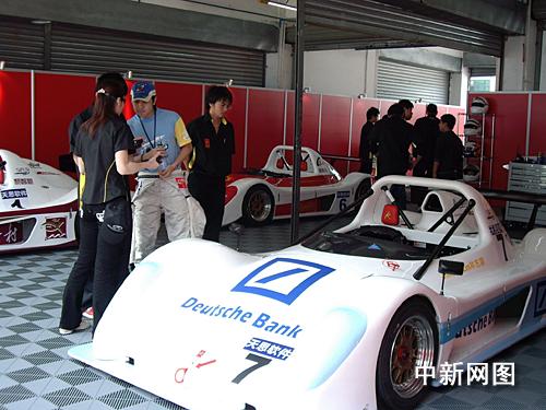 比赛前,林志颖正在认真地和助手们检查座驾。