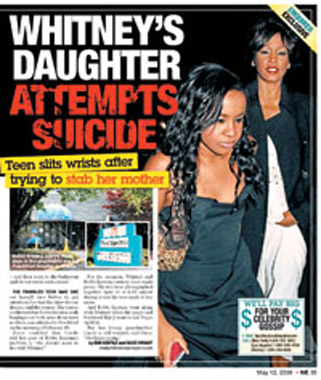 近日有美国某杂志爆料,歌坛天后级人物惠特尼·休斯顿曾遭女儿波比袭击。据称此次波比是准备自杀,而在自杀前想给母亲致命一击。事发后,波比被制服并送往精神科医院治疗。