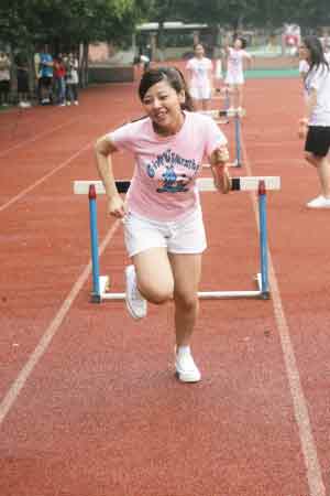 而接下来的跨栏更是让人笑弯了腰,除了大牙和小蛮这两个身高腿长的美眉能一跨而过,其他人都是慢吞吞地“走栏”——一脚跨过去,站定后另一脚才跨,特别是MeiMei,跑步的笨拙姿势让大家大笑不已。而到跳高时,鬼鬼几乎是连攀带爬,姿势十分狼狈,难得她跃过后还露出自信的微笑。而筱婕、小蛮和Apple都是双手摊平,企图正面跳过去,可是每次都落得个肚子压住横竿的结局,被黑人揶揄为“狗爬式。”