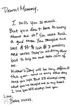欣宜亲笔写一封信给天国的母亲,一字一泪,令人心酸。
