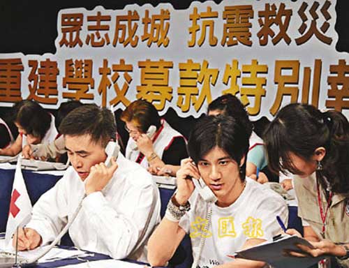 中新网5月19日电 据香港《文汇报》报道,台湾艺人举办筹款赈灾晚会 “众志成城抗震救灾,重建学校募款特别报道”节目,于前晚播出。历经4个小时的募款,共募得3千9百多万元。适逢当晚是王力宏32岁生日,对有份到场演出的Leehom来说特别有意义。