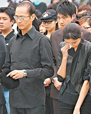 郑少秋(左)为尊重死难者除去帽子,在旁的蒙嘉慧不停用纸巾拭泪。