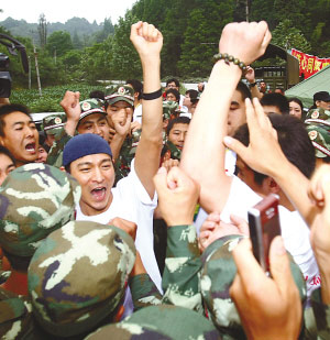 四川大地震灾情让众多演艺界人士牵挂,昨日,由刘德华、郑秀文、容祖儿、张国立、陈道明、冯小刚、蒋雯丽等十几人组成的明星团,来到灾区都江堰向峨乡,慰问救灾前线的子弟兵和部分灾区民众。每到一处驻地,战士们都备受鼓舞,大家互相加油打气,一声声“加油”的喊声响彻天空。