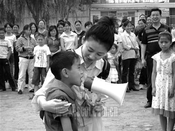 6月1日一早,央视节目主持人王小丫出现在地震灾区彭州市庆兴小学的操场上,与灾区孩子们一起庆祝“六一儿童节”的画面。王小丫胸前戴着一张“有希望就有未来”的爱心卡,教灾区孩子们画笑脸,和孩子们叠纸飞机、唱歌、做游戏,还给孩子们做心理辅导。