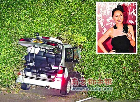 杨千嬅乘坐的私家车被一棵15米高的大树砸中,而人却没事,非常幸运。