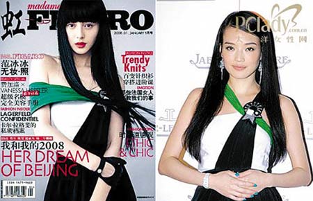 生活中,范冰冰却被网友称为“撞衫天后”———她跟不下十位圈中女星穿过同一款礼服。前几天的上海国际电影节,范冰冰穿着一套粉红色的Valentino长裙亮相,被网友看出这套礼服无论是颜色还是款式,都与今年3月舒淇参加香港亚洲电影大奖穿的礼服一模一样(见右下图)。这几年来,范冰冰出席大型活动或者是上杂志封面所穿的衣服,都一一被网友指出曾被圈中其他女星穿过,像章子怡、张曼玉、刘嘉玲、黎姿、萧亚轩,“还珠”姐妹林心如、赵薇、黄奕,甚至娱乐圈“新丁”张靓颖、汤唯。