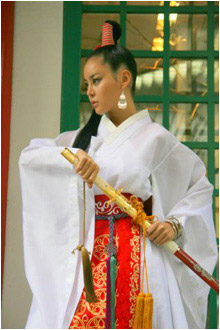 看到这张照片的网民纷纷指出:“虽说这款服装是以韩国女战士为主题设计的,但看上去带有浓郁的日本风。服装让人联想起和服,发型也是日本武士风格。”