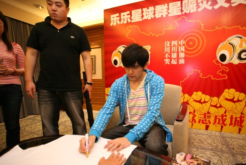由周杰伦和潘玮柏在现场为其精心挑选的义卖品签字拉开了此次活动的序幕。当晚,周杰伦和潘玮柏不顾全天工作的辛苦和旅途劳累,积极参加了“乐乐星球群星赈灾义卖活动”。