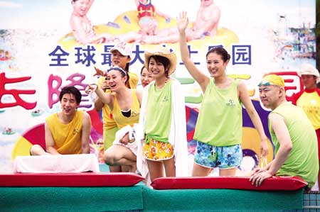 昨天下午,天公不作美,一直下雨,但这丝毫不影响“龙太子”的兴致,房祖名率领爱戴、Sara来到广州长隆水上乐园拍湖南卫视游戏节目《勇往直前》。虽然冒着雨,但房祖名玩得非常开心,一会大试飞腿踢足球,一会玩垂直滑道,一会更是“嘲笑”对手郭冬临又胖又笨掉下水,为了赢比赛,房祖名更是把韩国美女Sara的膝盖弄伤了,泪洒水上乐园。