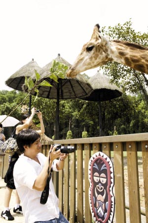 本月12日,黄磊以别克凯越旅行车的代言人和摄影发烧友的身份来到香江野生动物园,参加由《华夏地理》杂志主办的全球摄影大赛外拍活动。一进香江野生动物园的大门,黄磊就逗起挂在树上的两只鹩哥,热情地和它们打着招呼,可是鹩哥毫无反应,在数次逗弄没有得到回应之后,黄磊“悻悻”离去。来到长颈鹿园,黄磊显得异常忙碌,他给长颈鹿拍起了写真照———近景的,远景的,单个的,一对的,吃东西的,不吃东西的……为了更好地给长颈鹿取景,这位文艺帅哥还当众跪在地上。