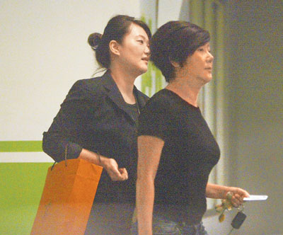 蓝心湄(右)取车时有专人负责提袋,侧面观察她小腹凸出。