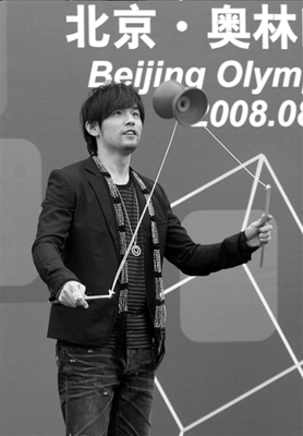 昨天,周杰伦、潘玮柏和S.H.E一起现身奥运中心区,参加某品牌商家展馆的开馆仪式。主办方安排了杂技、京剧等演出,周杰伦一时手痒,上前与杂技演员们切磋空竹技艺。