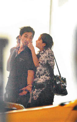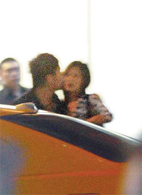 3小时后他与长腿妹离开,看来已有酒意,在路边等车时,长腿妹在大马路上张开双手抱他,深情对望,惹火身材直接贴上去,还在他耳朵吹气讲悄悄话,动作挑逗,他也没抗拒,回吻长腿妹。