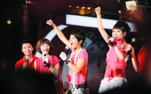 前日是北京奥运开赛首日,陈燮霞和庞伟分别在女子举重48公斤级和男子十米气手枪决赛中夺得金牌。为此,可口可乐昨晚在世贸天街广场举行庆祝中国首日夺金的仪式,成龙、S.H.E都出席并与市民一起分享了喜悦心情。当大屏幕上回放陈燮霞夺金的瞬间时,S.H.E三人忍不住在台上欢呼雀跃。可能是心情太过激动,三人现场演唱第一曲《中国话》时,竟然有点走调。