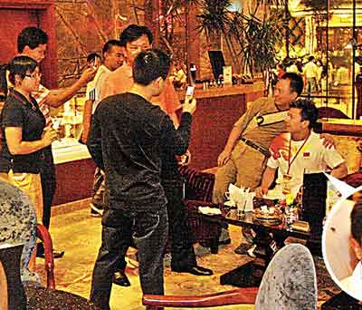 举重选手张湘祥相约友人在酒店咖啡室见面,却被男fans坐身边摄影合照。