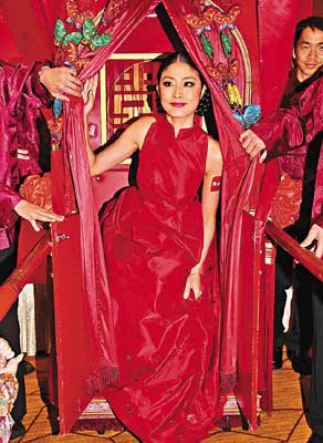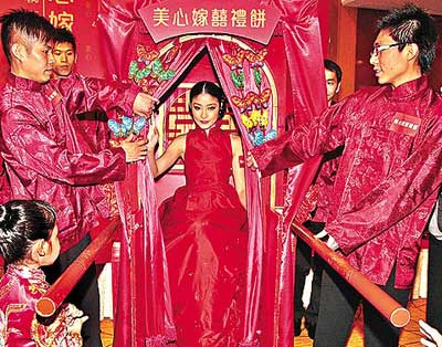 陈慧琳昨以新嫁娘打扮,乘轿进场为喜饼厂商宣传。