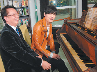 周杰伦(右)现场用钢琴表演创作,令主持人李四端十分佩服。