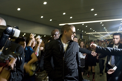 米勒乘坐从旧金山飞往上海的UA857航班在晚点半小时后,终于在17点50分降落在浦东国际机场。当告示牌显示“到达”时,守候多时的粉丝一阵欢呼,而媒体也开始拿起相机准备拍下米勒现身的一刻。不过这一等就是近一个小时,米勒在18点40分才出来。在这期间,米勒先是换上品牌商提供的黑色外套,然后就是取行李,还有就是等待接待方的安排。