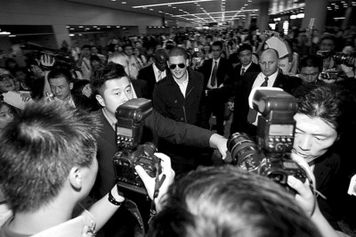 随着米勒的出现,在场的数十家媒体、上百名粉丝、几十个安保人员便如同突然上足了发条。他们形成了一个以米勒为中心的漩涡,不停把周围的人卷进来,又慢慢地抛在身后。闪光灯的密度甚至达到了每秒数十次,将硕大的到达大厅照得如同白昼。