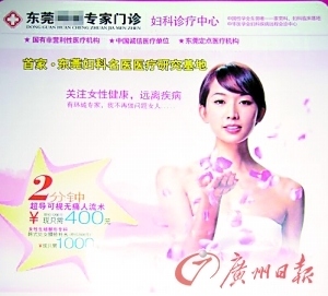 明星拍广告是常事,但广告天天有,东莞特别多。一不小心,刘德华成了东莞某诊所前列腺广告的“代言人”,清纯美女林志玲也笑靥如花地“代言”某诊所无痛人流广告,而容祖儿也着装性感地成为某诊所广告的封面女郎……