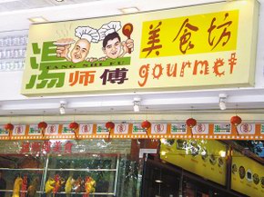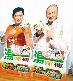 在网上搜索,“汤师傅”美食坊招牌十分卡通,用汤镇业汤镇宗两兄弟的头像戴上厨师帽做主造型,店里也挂满了两人同众多明星的合影。