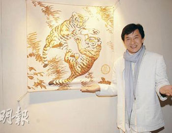 成龙与某品牌合作推出老虎图案的限量版丝质披肩,将会在香港义卖筹款。(图片来源:明报)