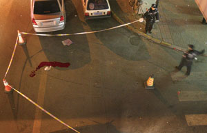 昨日20时许,首都体育馆东侧的过街天桥下,靠近人行便道处还残留着一大摊血迹,血迹周围圈起了警戒线。几名身穿写有“现场勘察”字样服装的警察,正忙着调查取证。