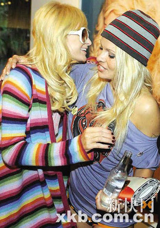 她身穿蓝色T恤,香肩半露,下身仅穿三角裤,站在裸体艳女画像前大摆pose,席间与“豪门欲女”帕丽斯·希尔顿亲密相拥打招呼。