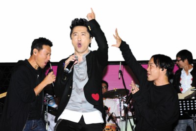 在昨日的发片会上,张学友和陈奕迅新老两歌神不仅到场助阵,还带来了庾澄庆最喜欢吃的巧克力和薯片,寓意他在香港“吃得开”。三人特别合唱了《爱你的只有一个我》、Rap版《爱是怀疑》以及摇滚版《吻别》。开唱前张学友打趣说:“情绪好点了吗?”陈奕迅还特别提醒在座媒体“留心歌词”。由于三人的表演非常精彩,有记者发问,庾澄庆是否考虑与张学友和陈奕迅组成一个类似“纵贯线”的乐队,庾澄庆说:“你刚才看到的表演我们才排练了十分钟,每一次他们都觉得哪里加一个和音会比较有亮点,在他们百忙之下一共合作了三次。我觉得我们三个首先应该有作品,因为学友马上就有专辑出来,Eason也正在录音,把三个人放在一起表演有困难,如何协调才是真的,所以先有歌会比较好。我们三个中,学友比较煽情,我比较摇滚,陈奕迅的发挥很即兴,写这首歌的人不一定是我,但是写的人一定会很过瘾。如果市场反应不错的话,可以跟‘贯纵线’拼一下。”