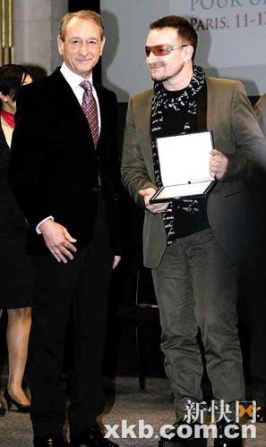 巴黎市长波特·德隆尼(Bertrand Delanoe)主持了颁奖仪式,女星佩内洛普·克鲁兹(Penelope Cruz)和法国第一夫人卡尔拉·布吕尼(CarlaBruni Sarkozy)出席了颁奖礼并表示祝贺。今年48岁的Bono获奖后表示:“这对我来说是很高的荣誉,坦率的说这就是我想要的,一个摇滚歌手获得诺贝尔奖的肯定。”
