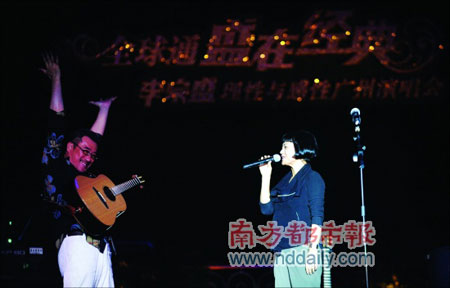 张艾嘉的出现令观众极为兴奋。这个被李宗盛称为“大姐”的女人一上台就调侃李宗盛:“在歌坛里,小李是我的最爱,那你的最爱是谁?”让李宗盛无言以对。她唱起了《我这样爱你到底对不对》、《因为寂寞》,还不忘轻松地在舞台上表现两个人的友情:“你们看过小李演的电影没有?他演的多数是喜剧,悲剧也能演成喜剧,每次都演我的丈夫或者男朋友,唉,我真的很不幸……”此外她还逼问:“你的歌都很浪漫,不知道你是不是一个浪漫的男人?”李宗盛据实以答:“把渴望而不可得的写入歌中,我的实际人生很沉闷的。”张艾嘉最后很奔放地劝说他:“再找个好点的,再生个妞。”记者 齐帅 摄影 马强