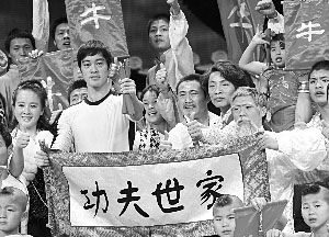 一部《李小龙传奇》让陈国坤成为2008年人气最旺的演员之一,由他参演的滑稽舞蹈《功夫世家》也是昨天彩排中人气最高的节目,虽然以李小龙装扮出现的陈国坤表演“双截棍”的时候,观众席上前排一位一直在玩游戏机的小男孩也看得拍起手来。《功夫世家》的风格相当搞笑,演员们有的穿着睡衣,拿着饭锅、菜板等道具,在一起“比武”。节目里面的人物很多“借鉴”自周星驰的电影作品,造型怪异,但却个个功夫高强,甚至《功夫》里的戴着“烫发卷”的“包租婆”也出场“搞笑”了。陈国坤在《功夫世家》中最后亮相,他除了表演双截棍外,还要用拳和腿分别击开两块木板。虽然是以舞蹈节目的形式出现,《功夫世家》在现场赢得的笑声并不比演员类节目少。