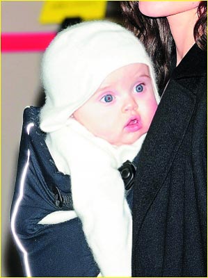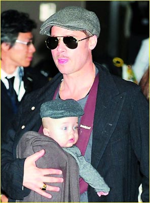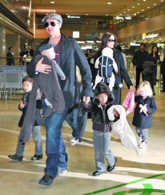 皮特和茱莉带着6名子女到东京,分别宣传两人的新片《本杰明·巴顿奇事》和《换子疑云》,全家在机场获礼遇快速完成通关。皮特胸前抱着诺克斯,左手牵着非洲裔养女扎哈拉,右手拉着越南养子帕克斯,率先入境,现场200多名“粉丝”瞬间陷入疯狂,尖叫声不断。茱莉则是怀抱维维恩,牵着希洛与马多克斯紧跟在后,她频向左方护栏后的“粉丝”微笑致意,希洛看了有样学样,也转身好奇地观望群众。马多克斯与扎哈拉显得心不在焉,倒是排行老二的帕克斯,似乎还不太习惯镜头与人群,他最后一个下飞机,入境时频频举手遮眼,甚至以衣服包头闪避镁光灯。