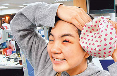 她左眼立刻肿起及严重瘀青,她回家后不断冰敷,还庆幸:“只差一点,就打到眼球,好险!”乐观的她昨进所属华研音乐办公室,还大喊:“快来看团团圆圆,来我这里看猫熊免排队喔!”不过她现在最担心周五预定要拍广告,目前左眼的瘀青没把握来得及消褪,华研表示若届时伤势未痊愈,只好跟厂商协调延期拍摄。