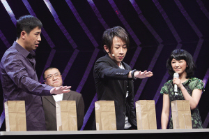 还是春晚那身打扮,刘谦不停给场下高呼他名字的粉丝放电,引发了一阵阵的尖叫声。第一次上场,刘谦就用纸巾变成了一条彩带,并让彩带从空中飞出去,把康洪雷导演接到了台上。不过这只是略施小技,为了考验康洪雷手下的胆量,刘谦用了五个纸盒,当着众人的面在其中一个中藏了一个破碎的啤酒瓶,然后让演员们用力去击打。还好,经过刘谦的“施法”,最后并没有一人受伤,不过倒把现场观众吓出一身冷汗。最后,刘谦把两个“团”字变成了一张《我的团长我的团》的海报,就完成自己的这次走穴任务。
