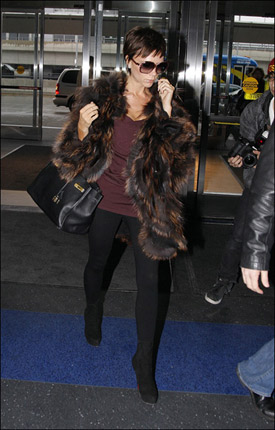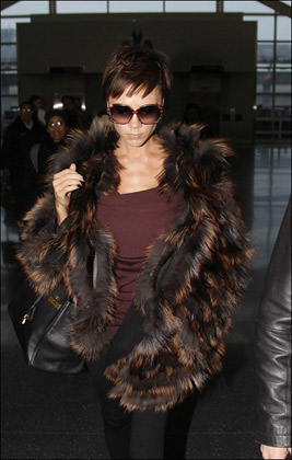 刚刚结束了阿玛尼第五大道开业典礼活动的维多利亚·贝克汉姆又马不停蹄的换回了雷人的装扮,摘掉了蓝色的发卡,换上了皮草大衣,这次的衣服毫无贵妇装扮可言,远远看去就像是一只被火烧到毛的火鸡,实在是雷人不浅,唯一值得一提的还是黑面上的那副墨镜,还是蛮好看的。