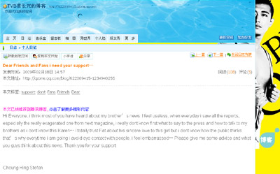 除了拖累个人事业外,他也间接连累了哥哥黄长兴。昨天,黄长兴在博客中大吐苦水,他坦言看到弟弟的新闻,觉得自己很没有用,虽然信任弟弟深爱Karen,却不知道公众的想法,而他近日外出时也要逃避与路人有眼神接触,希望粉丝给予意见,又感激大家的支持。