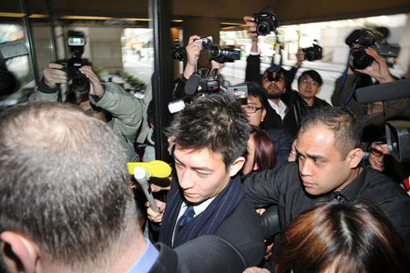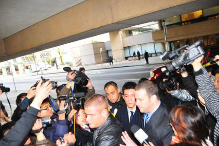 陈冠希在经理人陪同下,抵达温哥华高等法院应讯,经理人表示,原先法庭考虑陈冠希的安全,计划安排他在停车场直接进入法庭,不过经与陈冠希商量后,决定由正门进入,以显示陈对此宗案件坦然面对。