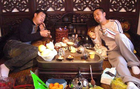 前段时间,有媒体曝光了一组小沈阳与哈尔滨好兄弟姜鹏的亲密合影照,两人脸贴脸、肢体似暧昧。姜鹏解释称,这是小沈阳去年生日的合影。近日,又一组有关姜鹏和小沈阳的合影被曝光,二人在一间仿古的老房子土炕上,围着圆桌半躺着,手里拿着大烟袋,摆出休闲自在之态。