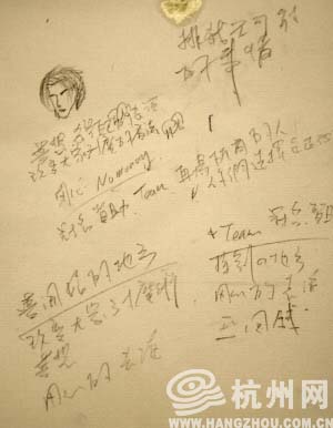 和所有的新闻发布会一样,刘谦的新闻发布会也有冗长的各赞助商发言时间。从台下看,刘谦在赞助商发言时间一直很认真地在记笔记,而事实上,他和每一个在无聊会议上的人一样,认真地在纸上乱涂乱画:一个小小的自画头像,几行无意义的汉字,还有一处写着“No money”,就是这位魔术师的会议笔记。