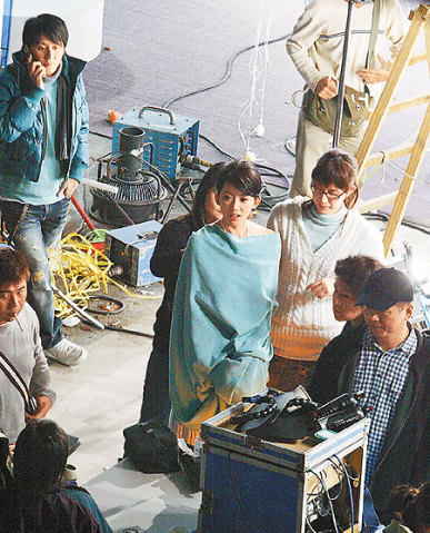 林志玲(左)下镜头,包着披肩御寒,在电视小屏幕前检视自己的演出。