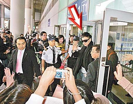 过百名fans到机场接机,Rain(箭嘴示)离开时也不停向她们挥手。